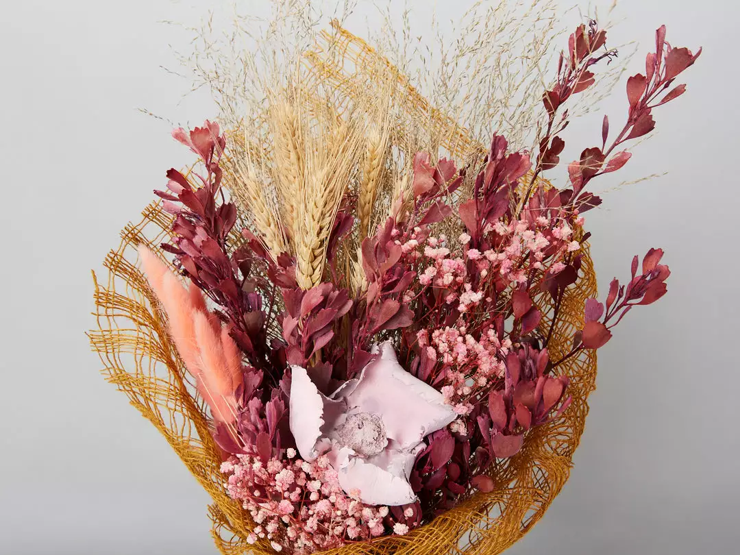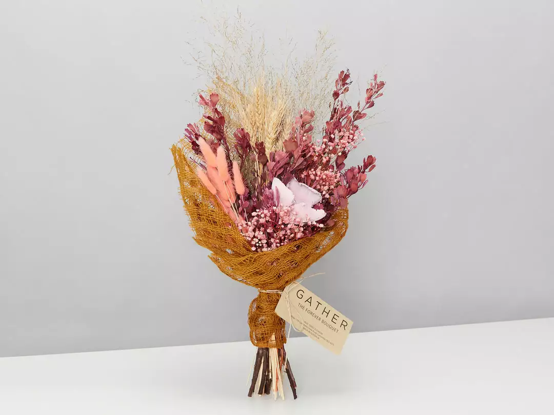 Dried flower posy (that’s florist speak for small bouquet), fully arranged and wrapped, ready to be gifted and to delight your recipient.