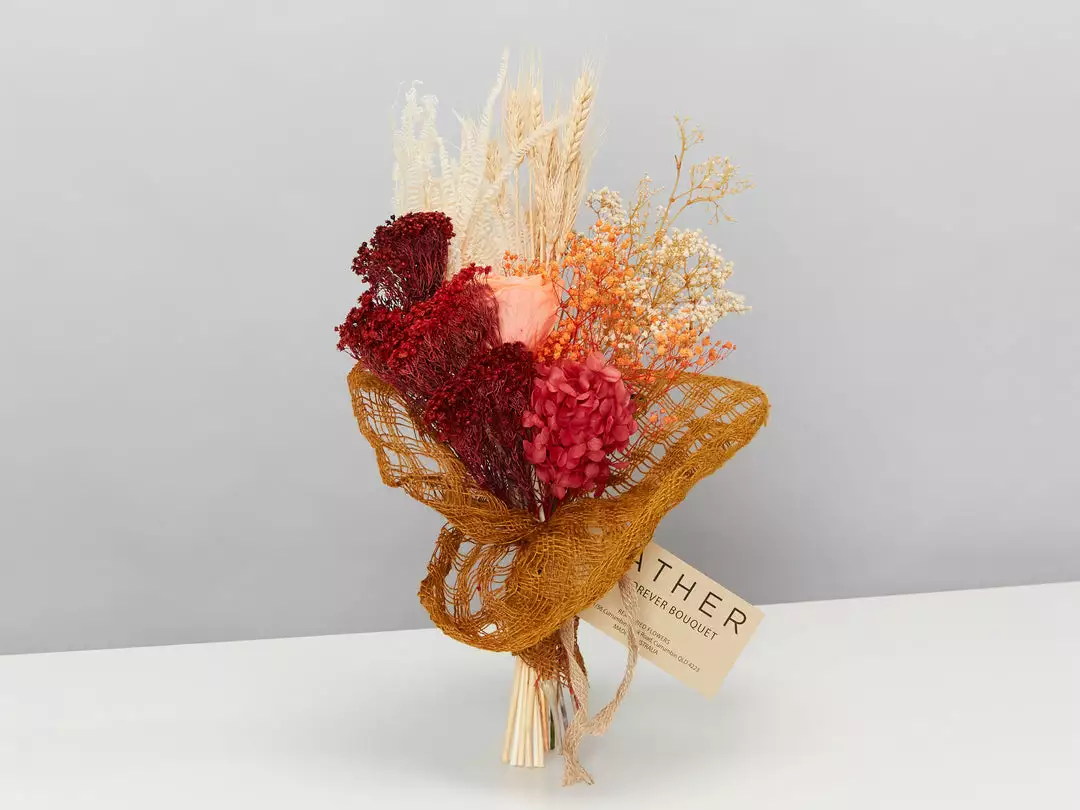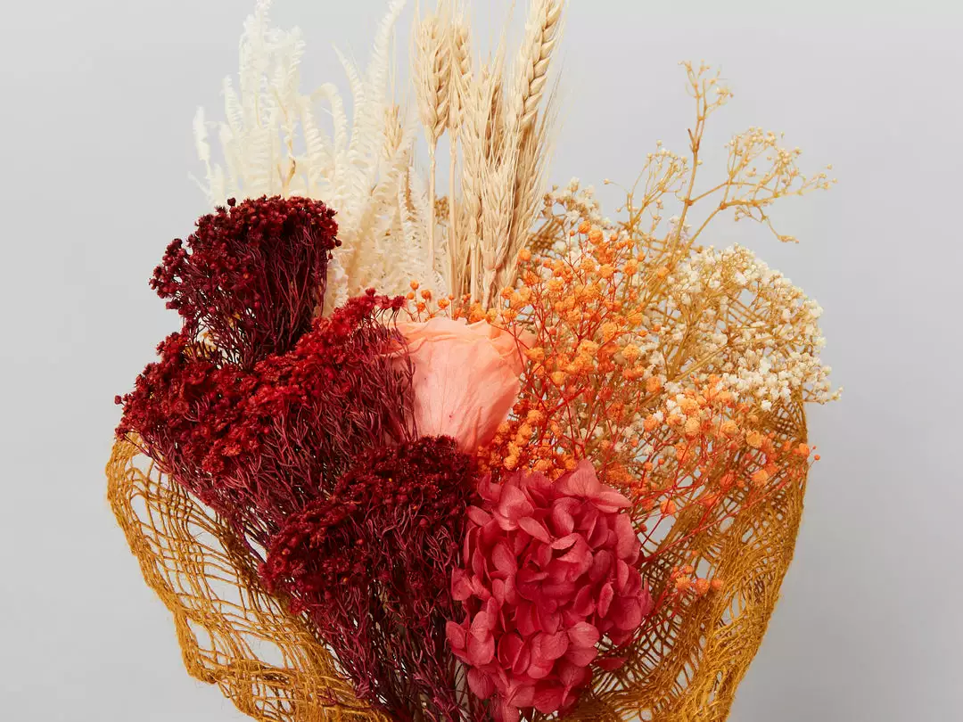 Dried flower posy (that’s florist speak for small bouquet), fully arranged and wrapped, ready to be gifted and to delight your recipient.