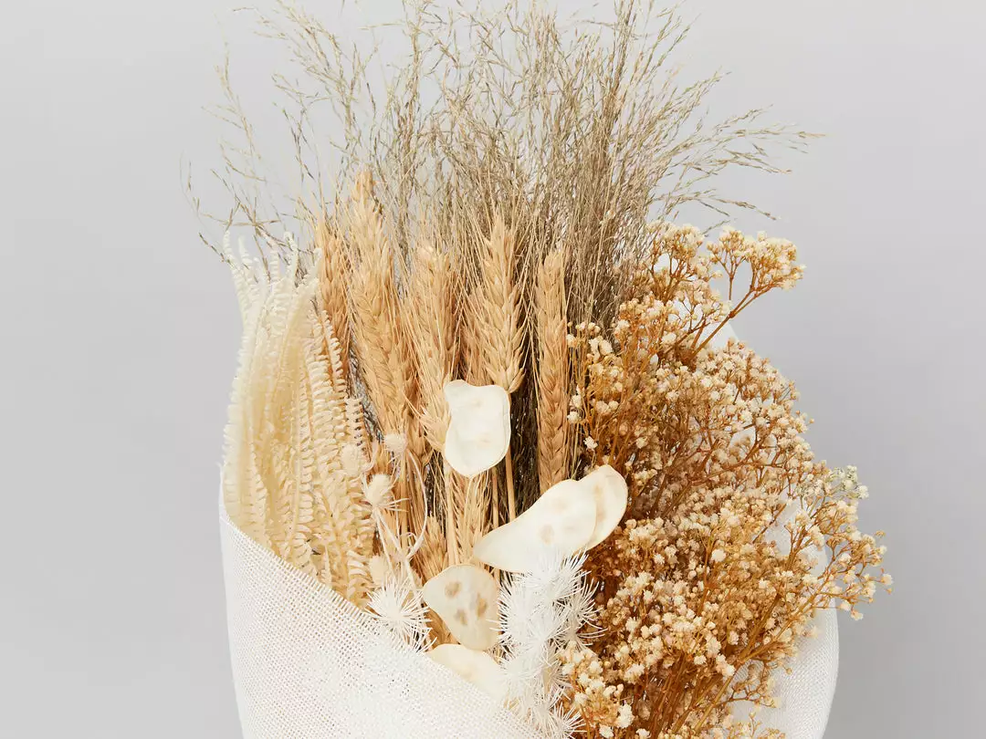 This coffee-cream coloured arrangement features dried favourites like bunny tails, Wheat and Gypsophila.