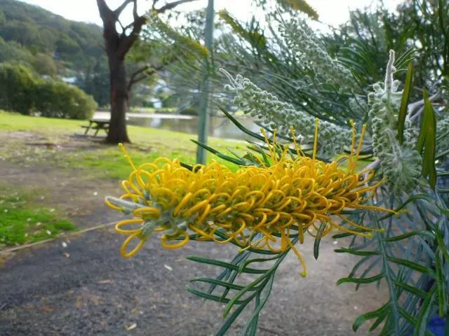 Grevillea Sandra Gordon is a fast-growing native shrub with beautiful large yellow flowers that remain for the best part of the year and attract plenty of pollinators.