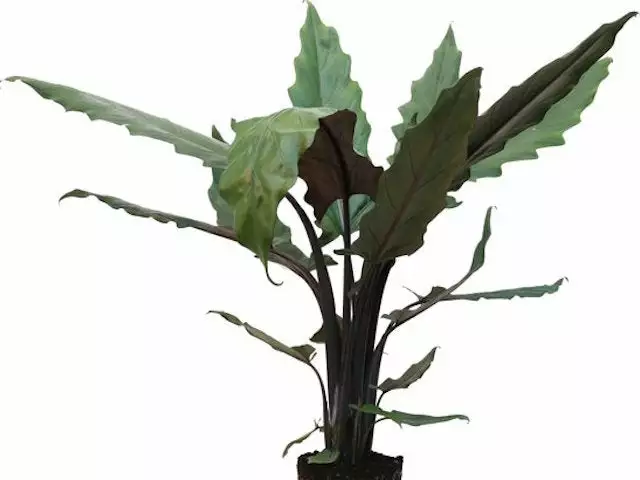 Alocasia Lauterbachiana is a good-looking guy with lance-shaped leaves and wavy scallops along the borders. He’s dark green on top but burgundy beneath with long mottled stems.