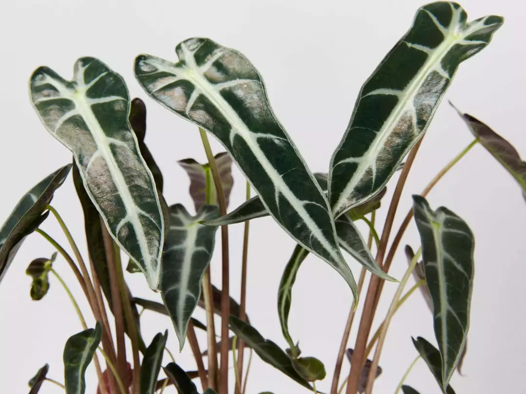 Alocasia lowii ‘Bebe’/’Bambino’ is all cutesy like a smaller, more compact version of Alocasia lowii ‘Polly amazonica’. The extremely glossy, dark green leaves are spear-shaped with broad, bold and white veins. It is a stunning feature plant that you can’t keep your eyes off.