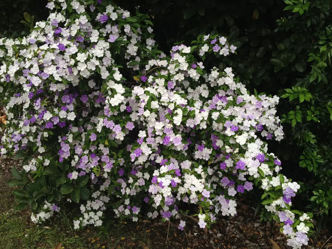 Brunfelsia latifolia ‘Sweet Petite’ is a dwarf variety of an old favourite also known as “Dwarf Yesterday, Today and Tomorrow“. The sweetly perfumed flowers change colour over successive days, opening as purple, fading to lilac and then finally to white. As the three different coloured flowers are present at the same time, a fabulously colourful display is created.Â