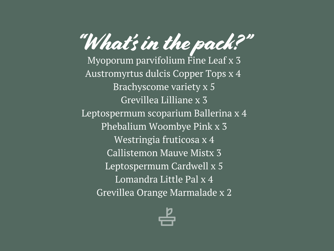 If you have a larger garden double up with our 80 plant pack. This pack includes all the plants above but double the listed amounts – so 10 Westringia and so on.