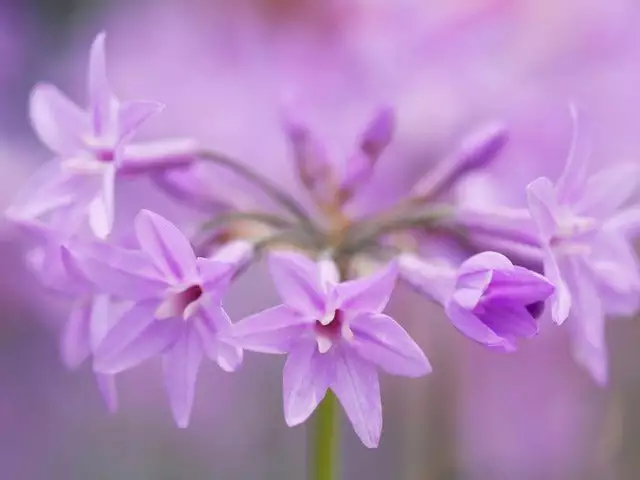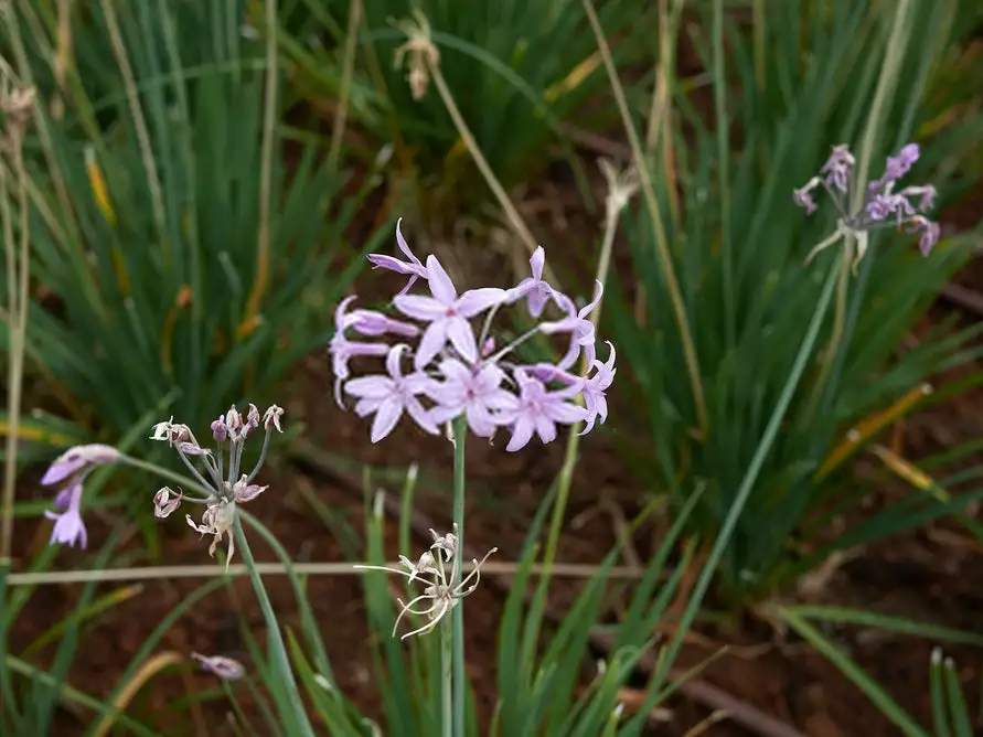 Tulbaghia cominsii x violacea Purple Eye has narrow grey-green leaves that form in upright clumps and produces small pink flowers with dark purple centres. When crushed the leaves have a strong garlic smell (hence the nickname Society Garlic). Purple Eye is a smaller more narrower version on the more common Tulbaghia violacea. This small plant is worth growing for the silver foliage and small flowers and does really well in a pot on sunny balcony.