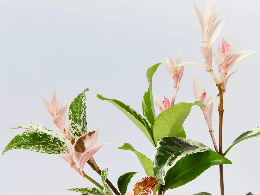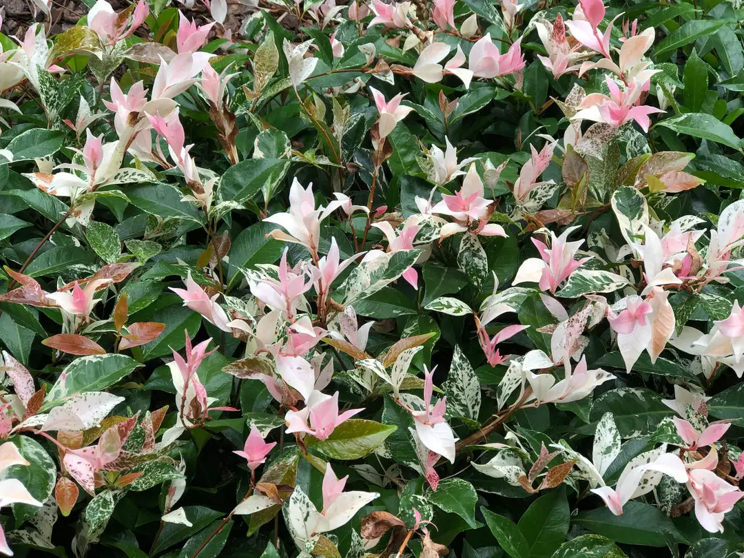 Trachelospermum jasminoides variegated “Star Jasmine”, also known as Jasmine tricolour. This plant has a beautiful mixture of leaf colours ranging from green to pink and white. You can hedge it, cover a wall with it, use as a ground cover, let it ramble down an embankment. Super versatile, is hardy, has a beautiful scented white star-like flowers. What more could you want?